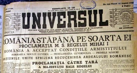 - Fara a scrie nimic despre evenimentele produse pe 23 august la Palatul Regal, atunci cand Regele Mihai a dat ordin ca Maresalul Ion Antonescu sa fie arestat, ziarul "Universul" titra brusc pe prima pagina "ROMANIA STAPANA PE SOARTA EI" si publica "PROCLAMATIA M.S. REGELUI MIHAI", inregistrata in seara de 23 august la Palatul Regal si difuzata imediat, la ora 22:25, la Radio. De asemenea, oamenii erau informati ca "ROMANIA A ACCEPTAT CONDITIILE ARMISTITIULUI". In realitate, Conventia de Armistitiu de la Moscova avea sa fie semnata abia pe 12 septembrie.
