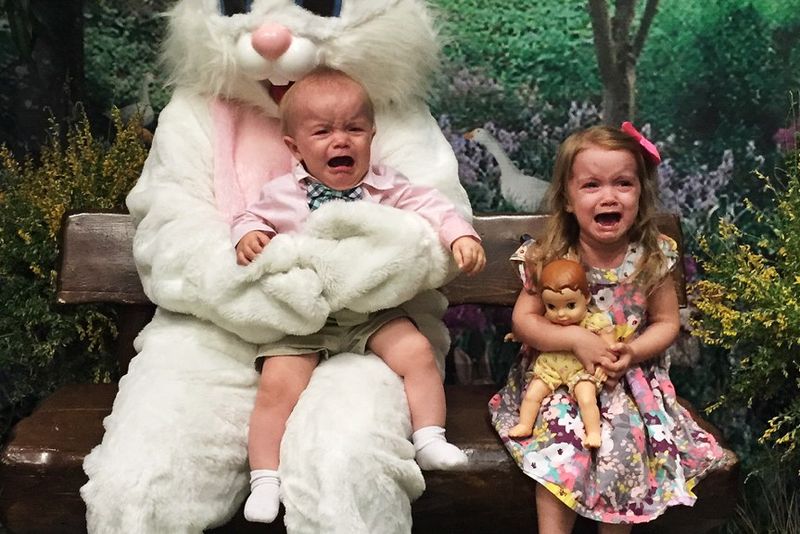 Tradiția de a face poză cu Moș Crăciun, cu iepurașul de Paști sau cu alte mascote odioase terorizează copii de ani buni de zile.