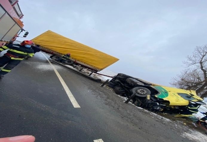 FOTO | Accident grav pe şoseaua dintre Cluj şi Oradea. Tânăr rănit după ce s-a răsturnat cu TIR-ul