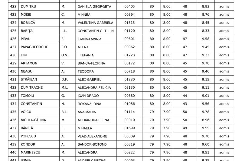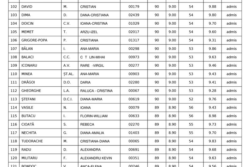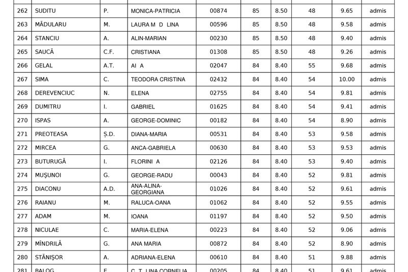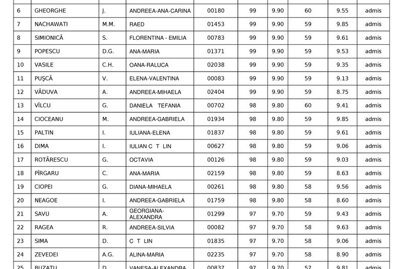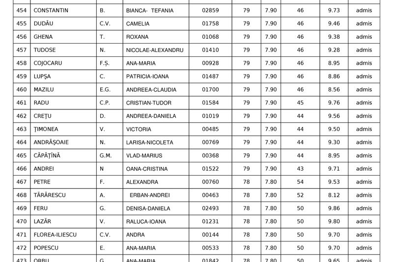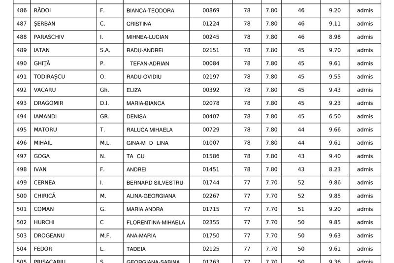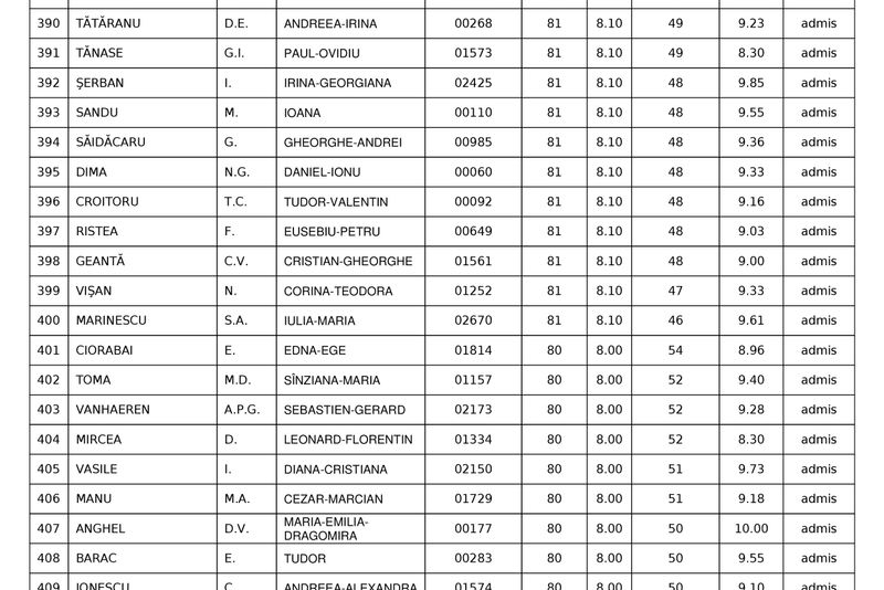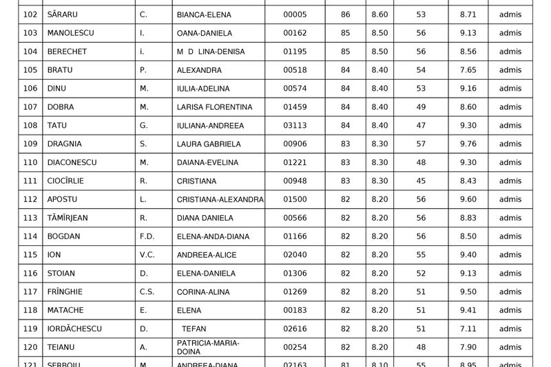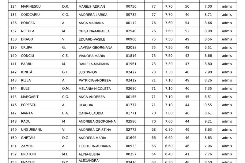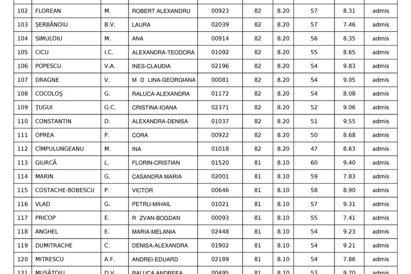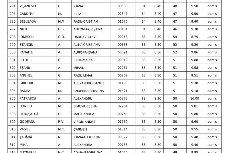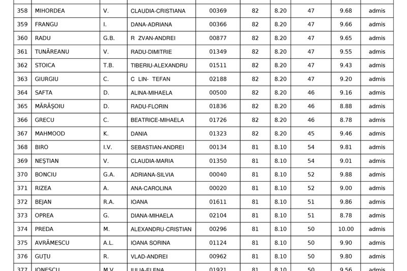 7. Lista candidaţilor admişi se afişează în ordinea descrescătoare a punctajului obţinut și în limita locurilor finanţate de la buget acordate fiecărei facultăţi în parte. Lista candidaţilor respinşi se afişează în ordine alfabetică.