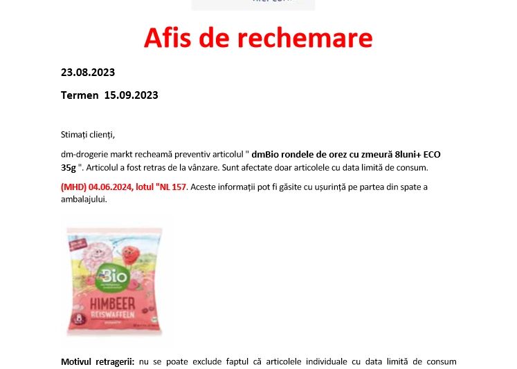 Consumatorii sunt sfătuiți să returneze produsul nedeschis sau deja deschis la orice locație a retailerului DM. Prețul de achiziție va fi rambursat chiar și fără prezentarea bonului fiscal. Produsele pot fi returnate până pe data de 15 septembrie 2023.