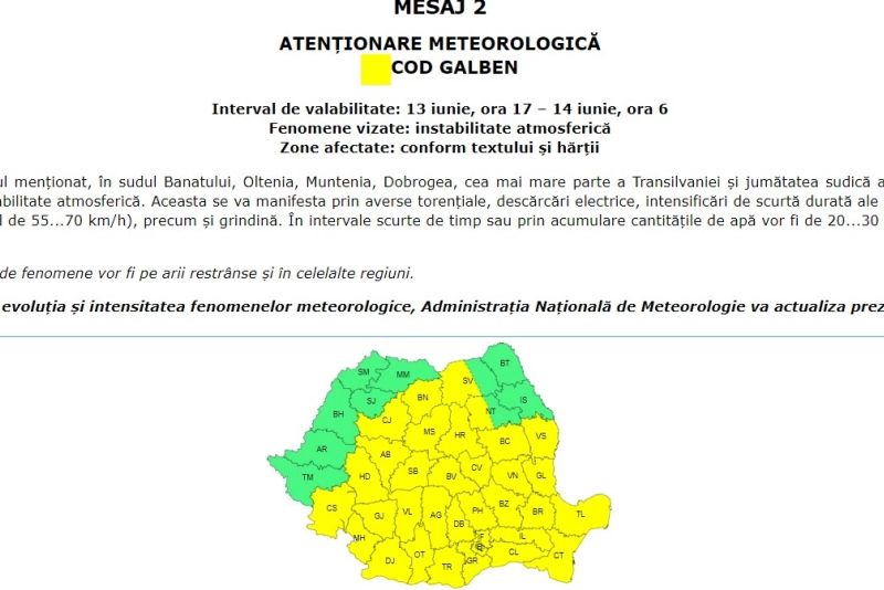 Începând de joi, ora 17:00, și până vineri, ora 06:00, va intra în vigoare un Cod galben de furtuni care va afecta aproape toată țara. Avertizarea este valabilă pentru sudul Banatului, Oltenia, Muntenia, Dobrogea, cea mai mare parte a Transilvaniei și jumătatea sudică a Moldovei. În aceste regiuni se vor înregistra perioade cu instabilitate atmosferică accentuată, manifestată prin averse torențiale, descărcări electrice, intensificări ale vântului și vijelii, cu rafale de vânt ce pot ajunge între 55 și 70 km/h, precum și grindină.