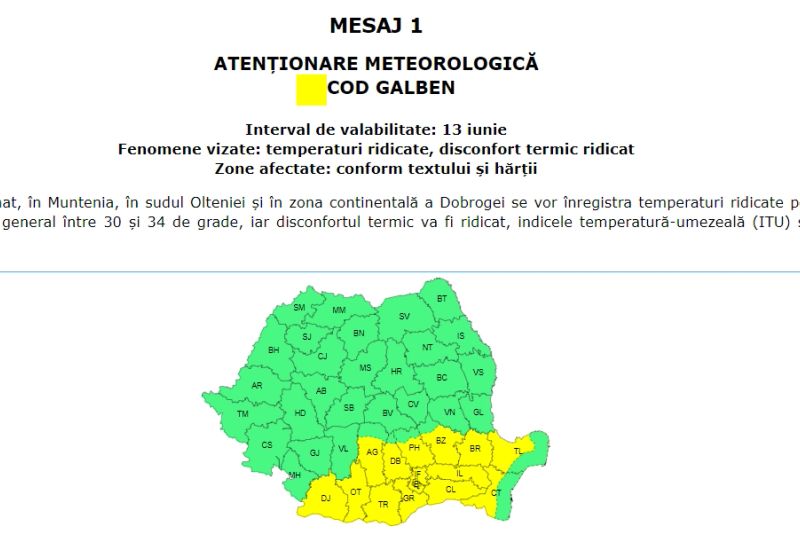 Joi, meteorologii au emis un Cod galben de caniculă valabil pentru București și 14 județe din sudul și sud-estul țării. Printre județele vizate se numără Dolj, Olt, Argeș, Teleorman, Giurgiu, Dâmbovița, Prahova, Ilfov, Călărași, Ialomița, Buzău, Brăila, Tulcea și Constanța. În aceste zone, temperaturile maxime vor oscila între 30 și 34 de grade Celsius, iar disconfortul termic va fi ridicat, cu indicele temperatură-umezeală (ITU) situându-se în jurul valorii de 80 de unități.