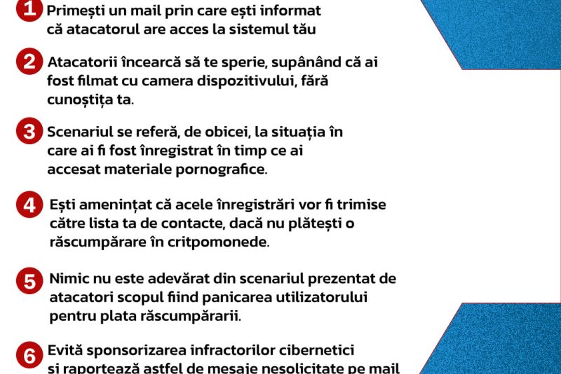 Noua amenințar pe mail constă în mesaje în care utilizatorul este anunțat că a fost filmat, fără știrea sa, în diverse ipostaze compromițătoare, cel mai des invocându-se faptul că ar fi accestat site-uri pornografice. Pentru ca filmarea să nu fie distribuită tuturor contactelor din agendă și mail, autorii mail-ului cer o răscumpărare în criptomonedă.