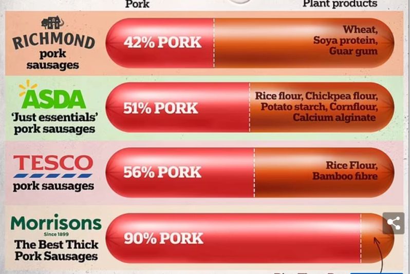 În general, toți producătorii au grijă să respecte reglementarea alimentară ca produsele să aibă cel puțin 42% carne, dar în restul compoziției au apărut tot soiul de înlocuitori vegetali sau de altă natură., mai arată Daily Mail.