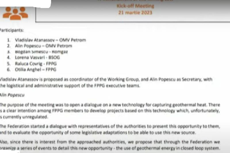 Modernizare e necesara pentru noi tehnologii. Ei vorbesc ca și cum ei reprezintă Guvernul României și ei fac această lege, nu Parlamentul, nu Guvernul. Modernizarea acestei legi este esențială pentru a introduce noi tehnologii și a stimula investițiile în sectorul energetic. Noi tehnologii, atenție. Apele termale. Pentru a ne asigura, ne-am dori să includem experti FPPG în grupul de lucru care sa se alăture acestui grup membri din compania dvs. (...) În cazul în care sunteți de acord, vă rugăm să ne transmiteți nominalizările dvs până cel târziu marți, 7 martie 2023. (...)
