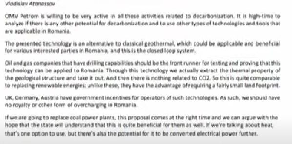 „(în draft) se spune o nouă tehnologie a fost implementată recent. (...) în cogenerare de electricitate și căldură. Acest sistem va permite celui care pune mâna pe sondele, pe dreptul de a face gaura în pământ, acea companie va pune mâna pe întreg sistemul. Orice sursă de căldură sau energie pe teritoriul României. Practic își cumpără o țară”, a comentat și H.D. Hartmann.