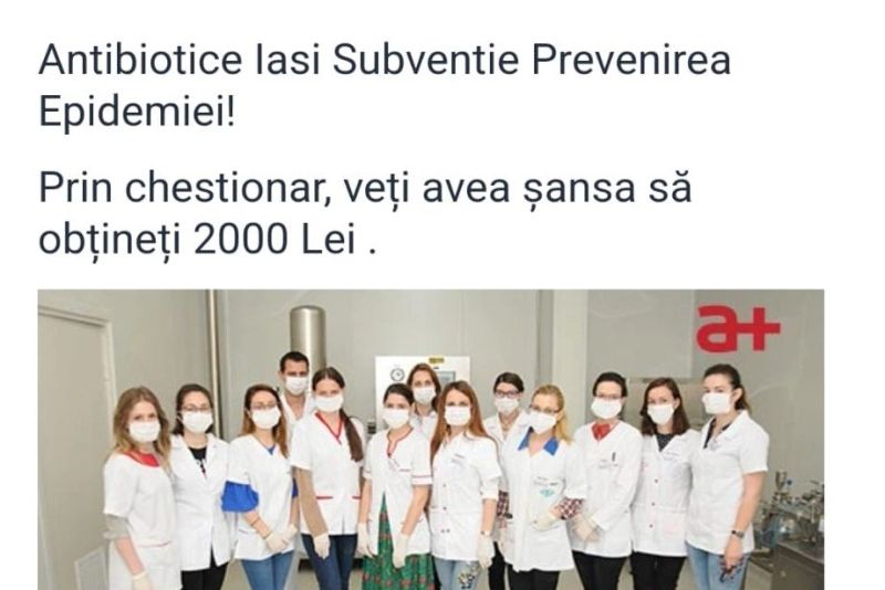 „Facem precizarea că Antibiotice nu are nicio legătură şi se delimitează ferm de această campanie, care este în fapt o tentativă de fraudă. Aşadar, avertizăm persoanele care primesc link-uri ce trimit spre „Antibiotice Iasi, subvenţie pentru prevenirea epidemiei” şi îndemnul de a completa un chestionar având ca recomensă suma de 2.000 lei, să NU acceseze link-ul şi să NU furnizeze date la cerere pentru a câştiga eventuale premii”