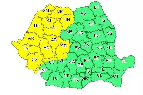 De asemenea, a fost lansat un cod galben de inundații, valabil până astăzi la ora 12,00. Alerta este valabilă pentru râurile Mureş – afluenţii aferenţi sectorului aval confluenţă cu Târnava (judeţele: Alba, Sibiu, Hunedoara şi Arad), Bega – bazin superior şi afluenţi bazin mijlociu şi inferior, Timiş – bazin superior şi afluenţi bazin mijlociu şi inferior, Bârzava, Moraviţa, Caraş, Nera – bazin superior şi afluenţi bazin mijlociu şi inferior (judeţele: Timiş şi Caraş Severin), Jiu – bazin superior amonte S.H. Sadu şi afluenţii aferenţi sectorului aval S.H. Sadu – amonte S.H. Rovinari (judeţele: Hunedoara şi Gorj), Crişul Repede – bazin superior şi afluenţi bazin mijlociu şi inferior (judeţele: Cluj şi Bihor), Crişul Negru – bazin superior şi afluenţi bazin mijlociu şi inferior (judeţele: Bihor şi Arad), Crişul Alb – bazin superior şi afluenţi bazin mijlociu şi inferior (judeţele: Hunedoara şi Arad), Arieş – bazin superior şi afluenţi bazin mijlociu şi inferior (judeţele: Alba şi Cluj).