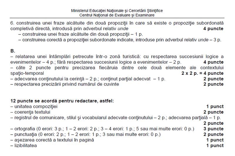 Vei primi 12 puncte pentru redactarea întregii lucrări (unitatea compoziției - 1 punct, coerența textului - 2 puncte, registrul de comunicare, stilul și vocabularul adecvate conținutului - 2 puncte, ortografia - 3 puncte, punctuația - 2 puncte, așezarea corectă în pagină, lizibilitatea - 2 puncte).