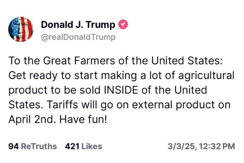 În noaptea de 3 martie, Donald Trump a postat un mesaj prin care le spunea fermierilor americani să se pregătească să vândă produsele în interiorul țării.