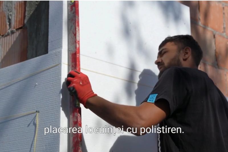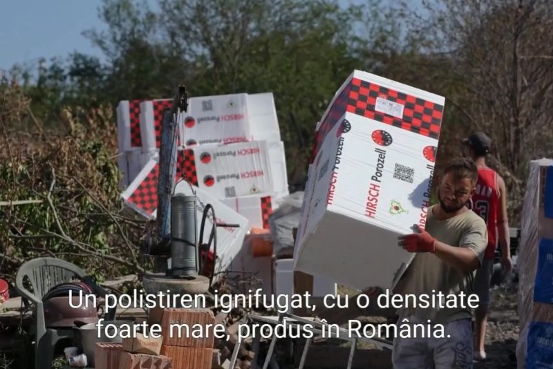 „În ziua 6, constructorii au început placarea locuinței cu polistiren. Un polistiren ignifugat, cu o densitate foarte mare, produs în România. Ce înseamnă ignifugat? Un polistiren care nu va întreține focul. Și tot astăzi, dulgherii au început acoperișul construcției noastre. Am achiziționat 120 de metri pătrați de polistiren. Adică 50 de baxuri de polistiren ignifugat. Pentru lipitul polistirenului, placarea lui exterioară, s-au cumpărat 60 de saci de adeziv CT82, un adeziv special, care costă 55 de lei sacul.