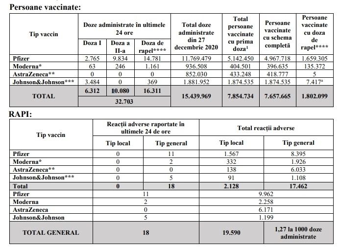Cifrele de vaccinare pentru ultimele 24 de ore sunt descurajante: aproximativ 6.000 de români au ales să se vaccineze anti-COVID-19 cu prima doză. Restul, până la peste 30.000 de persoane vaccinate o reprezintă cei care și-au încheiat schema de vaccinare cu rapelul sau doza BOOSTER, potrivit bilanțului oficial transmis de autorități.Bilanț 13 decembrie – evidența persoanelor vaccinate împotriva COVID-191. Persoane vaccinate în ultimele 24 de ore: 32.703;2. Persoane vaccinate cu prima doză în ultimele 24 de ore: 6.312;3. Total persoane vaccinate: 7.854.734;4. Persoane vaccinate cu schemă completă: 7.657.665;5. Persoane vaccinate cu doza de rapel: 1.802.099;6. Total doze administrate din 27 decembrie 2020: 15.439.969.Potrivit datelor puse la dispoziția Comitetului Național de Coordonare a Activităților privind Vaccinarea împotriva COVID-19 (CNCAV) de către Institutul Național de Sănătate Publică (INSP-CNSCBT), prin aplicația Registrul Electronic Național al Vaccinărilor (RENV), care ține evidența vaccinărilor, situația din ziua de 13 decembrie a.c., ora 17.00, este următoarea: