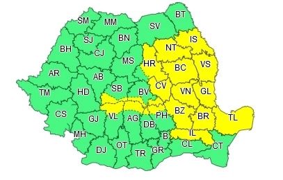 În cea mai mare parte a Moldovei, în nordul Dobrogei, estul Munteniei, precum și local în zona Carpaților Meridionali și Orientali vor fi perioade cu instabilitate atmosferică accentuată. Aceasta se va manifesta prin intensificări ale vântului și vijelii (cu viteze de peste 55...70 km/h), descărcări electrice, averse torențiale și izolat grindină. Cantităţile de apă vor depăşi 20...30 l/mp.