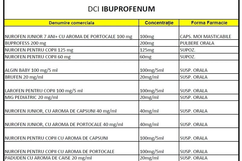 Ministerul prezintă și o listă de medicamente antitermice și antiinflamatoare care sunt disponibile, inclusiv Nurofen: