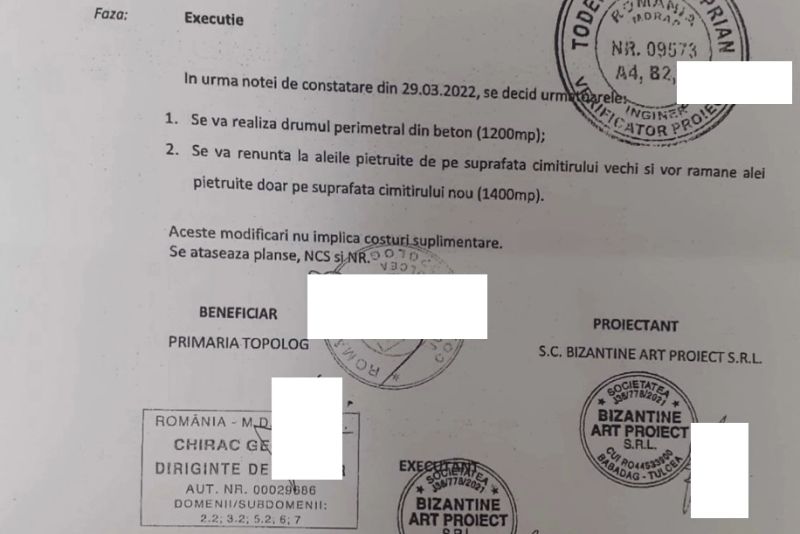 Individul de la ”recorder” are și un puseu de sinceritate. Probabil impresionat de locul în care se afla, în cimitir, acesta recunoaște că lucrarea nu se putea face ca în proiect pentru că se trecea peste morminte. Însă, din nou, acuzațiile insului sunt complet false. El a omis, sigur intenționat, să spună că există o dispoziție de șantier, pe care noi o atașăm la acest comunicat de presă, care demonstrează clar că drumul perimetral, cel din beton, va avea 1.200 de mp (în realitate are 1.600 de mp), iar aleile pietruite vor avea o suprafață totală de 1.400 de mp. La acești 1.400 de mp de pietriș se adaugă și cei 1.600 de mp de sub beton, totalul fiind de 3.000 de mp de pietriș, în comparație cu cei 1.200 de mp din dispoziția de șantier.