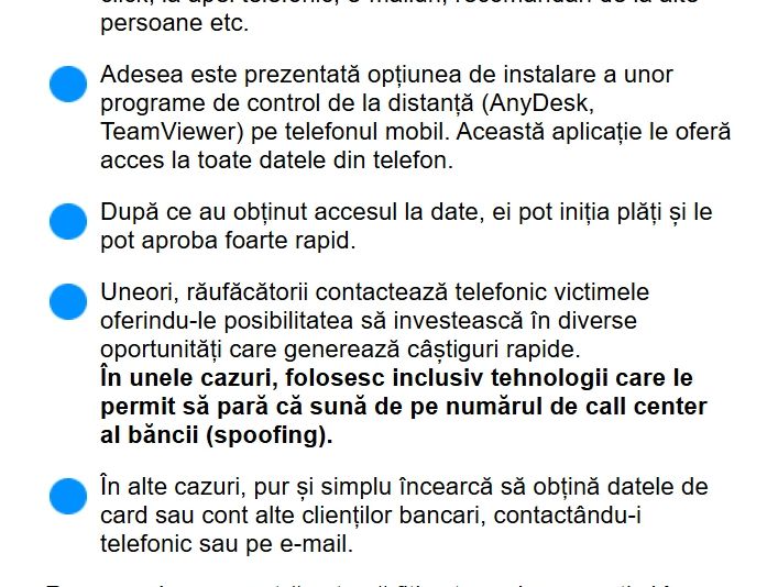 De asemenea, atacatorii pot contacta clienții prin telefon sau e-mail pentru a obține datele cardurilor sau ale conturilor bancare. Este important să subliniem că băncile nu solicită niciodată informații confidențiale prin aceste canale.