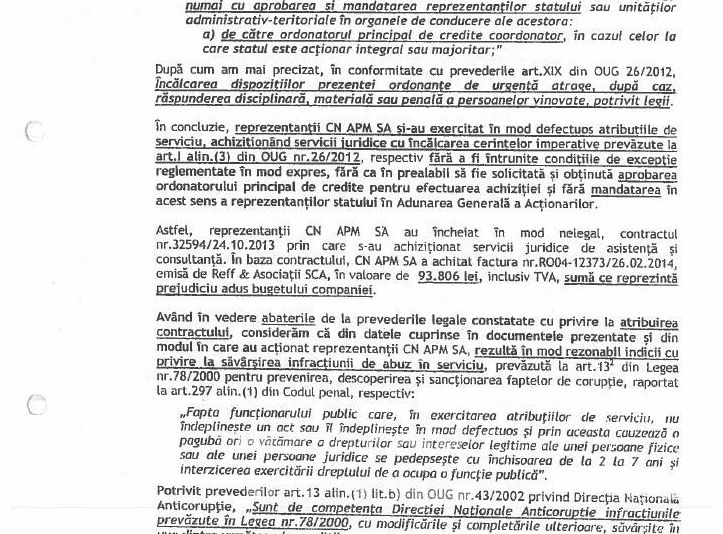 Raportul arată că tot ilegal au fost achiziționate și serviciile juridice, cu încălcarea cerințelor OUG 26/201 și fără ca în prealabil să fie obținută aprobarea de la ordonatorul principal de credite Ministerul Transporturilor, în subordinea căruia funcționează CNAPMC. Conform anchetei MT, în noiembrie 2013, conducerea executivă a companiei a achiziționat direct și fără respectarea prevederilor legale referitoare la achizițiile publice. În plus, potrivit aceleiași OUG 26/2012, companiile naționale si societățile comerciale cu capital de stat, care au în structura organizatorică departament juridic - CNAPMC are un serviciu juridic cu 5 oameni -, nu pot să achiziționeze servicii juridice de consultanță. Comisia de control a Ministerului recomandă și sesizarea ANRMAP în acest caz și atrage atenția asupra indiciilor de săvârșire a infracțiunii de abuz în serviciu. Iar potrivit prevederilor OUG 43/2002 privind activitatea DNA, aceste fapte încadrabile în legea 78/2000 sunt de competența DNA, concluzionează raportul.