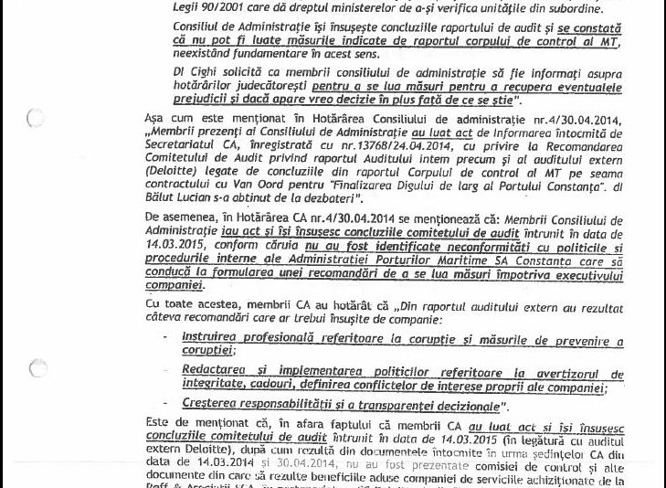 Pe locul doi în topul abuzurilor ar putea fi contractul de achiziție a serviciilor de auditare care implică una dintre cele mai mari firme de audit din Big Four. În august 2013, CNAPMC a încheiat un contract cu Deloitte România, în asociere cu casa de avocatură “Reff și Asociații”, care activează sub umbrela Deloitte Audit SRL. Obiectul contractului era tocmai auditul legal cu privire la eventualele aspecte de nelegalitate la contractele cu Van Oord și Royal Haskoning. Din analiza clauzelor, livrabilelor și facturii reiese în mod cert, susține actualul raport al Corpului de Control, că CNAPMC a achiziționat de fapt servicii de asistență și consultanță juridică și nu de auditare. Altfel spus, conducerea CNAPMC a schimbat cu bună știință codul serviciilor achiziționate pentru a da aparența de legalitate - serviciile de auditare sunt incluse la servicii de contabilitate, de audit și gestionare a registrelor contabile.