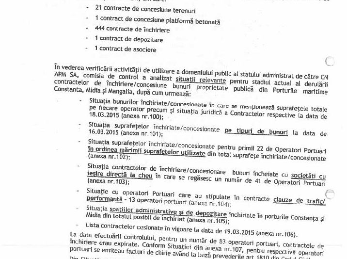 La data de 19 martie, se constata că CNAPMC avea în derulare 468 de contracte de închirieri si concesiuni. În cazul multora dintre aceste contracte, s-au constatat deficiente privind atribuirea lor, astfel că echipa corpului de control recomandă la măsuri “sesizarea Autoritatii Nationale pentru Reglementarea si Monitorizarea Achizitiilor Publice (ANRMAP), in vederea constatării contraventiilor si aplicarii sanctiunilor prevazute de O.U.G. nr. 34/2006.” Mai mult, șefii CNAPMC nu au luat masuri de eficientizare a contractelor in perioada de derulare a acestora, iar “prin actele juridice semnate ulterior au intarit pozitia concesionarilor in defavoarea interesului CN APM S.A. si implicit a statului.”