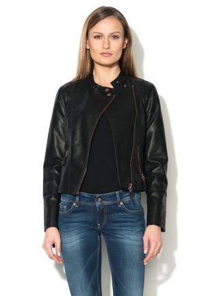 Jacheta biker de culoare neagra cu mansete cu fermoar imita foarte bine pielea, este fabricate din poliuretan si vascoza si face parte din colectia Vero Moda Denim. Pretul poate fi gasit AICI.