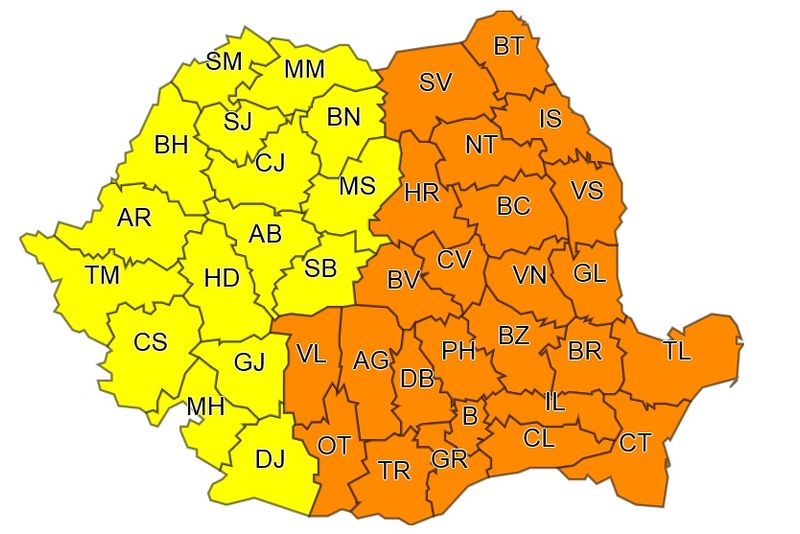 Jumătatea de est a țării se află sub cod portocaliu, fiind vorba de emperaturi foarte scăzute, atât noaptea, cât și ziua. Zone afectate: Moldova, estul Transilvaniei, Muntenia, Dobrogea și local Oltenia.