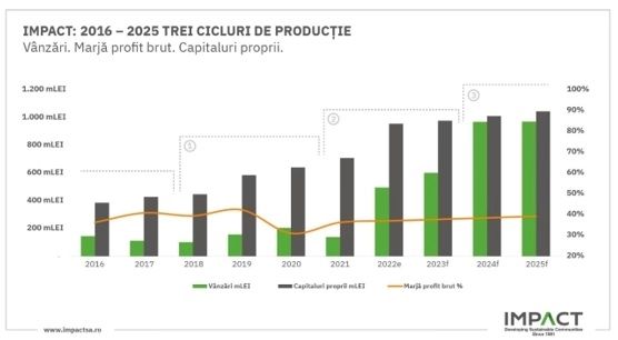 În graficul de mai jos sunt prezentate estimările companiei în contextul strategiei anunțate, care indică ritmul de capitalizare al companiei, dar și conversia proiectelor în rezultate financiare, cu accent pe menținerea marjelor de profit. Se pot remarca, de asemenea, trei cicluri de producție.