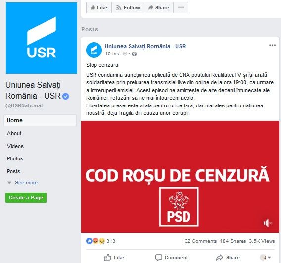 La rândul său, Uniunea Salvați România a postat, pe pagina sa de Facebook, un mesaj de susținere pentru Realitatea TV: