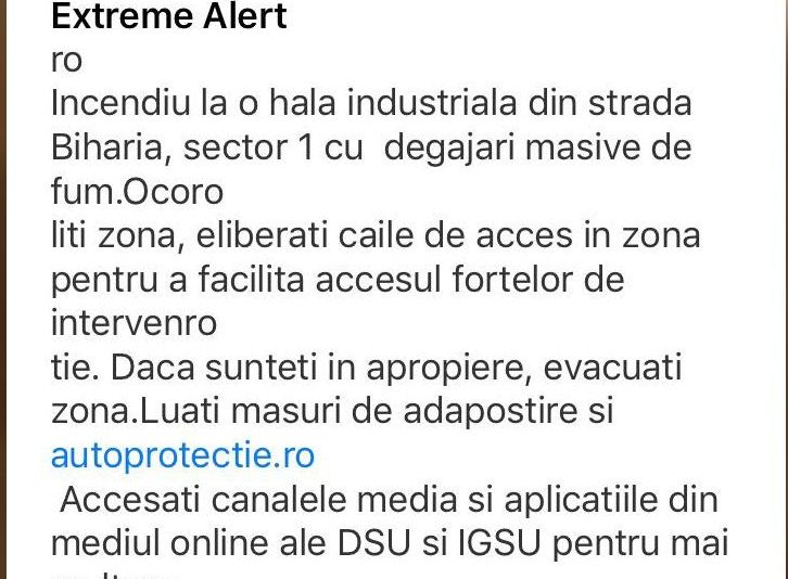 ”Incendiu la o hală industrială din strada Biharia, sector 1 cu degajări masive de fum. Ocoliți zona, eliberați căile de acces în zona pentru a facilita accesul forțelor de intervenție. Dacă sunteți în apropiere, evacuați zona. Luați măsuri de adăpostire și autoprotecție. Accesați canalele media și aplicațiile din mediul online ale DSU și IGSU pentru mai multe informații și actualizări despre eveniment. IGSU”, a precizat mesajul.