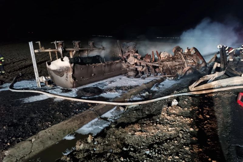 Incendiu violent la o cisternă răsturnată care transporta 40 de tone de motorină, în județul Brăila: șoferul a murit carbonizat - FOTO