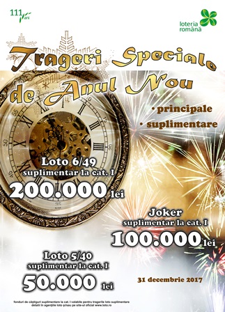 LOTO DE REVELION 2O18. Pentru cea de-a doua tragere, Loteria Romana suplimenteaza fondul de castiguri al categoriei I dupa cum urmeaza: