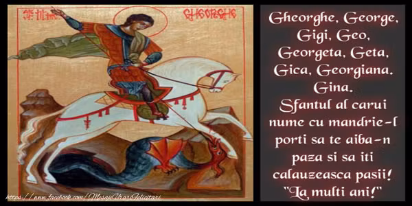Îţi urez La mulţi ani, pentru că porţi acest nume şi fie ca Sfântul Gheorghe pe care îl reprezinţi, să-şi coboare ochii asupra ta şi să îţi dăruiască fericirea dorită şi liniştea interioară.