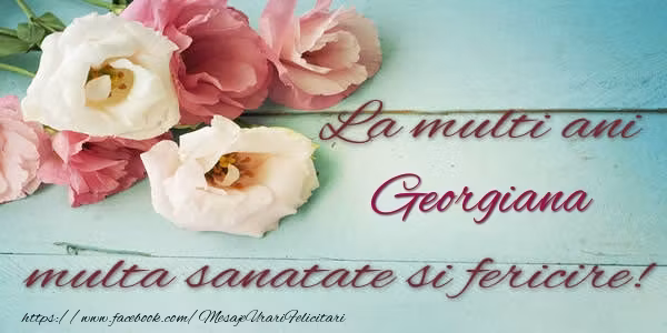 Felicitări de Sf. Gheorghe: La mulţi ani, George! La mulţi ani, Georgiana! La mulţi ani de Sf. Gheorghe!„La mulţi ani cu veselie / Sănătate pe vecie / Casa plină de bucate / Dragoste pe săturate / Bani la greu / Noroc cu carul / La mulţi ani şi sus paharul!!”