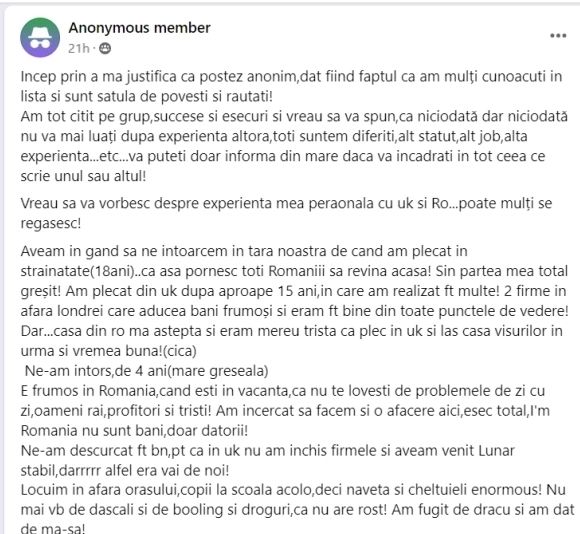 "Am tot citit pe grup, succese și eșecuri și vreau să vă spun, că niciodată dar niciodată nu vă mai luați după experiența altora, toți suntem diferiți, alt statut, alt job, altă experiență… etc… Vă puteți doar informa din mers dacă vă încadrați în tot ceea ce scrie unul sau altul!Vreau să vă vorbesc despre experiența mea personală cu UK și România… poate mulți se regăsesc!O femeie a ajuns să facă transplant de ficat după ce a luat paracetamol după urecheAveam în gând să ne întoarcem în țara noastră de când am plecat în străinătate (la 18 ani).. că așa pornesc toți românii să revină acasă! Și în partea mea total greșită! Am plecat din UK după aproape 15 ani, în care am realizat foarte multe! Două firme în afara Londrei care aduceau bani frumoși și eram foarte bine din toate punctele de vedere! Dar… casa din România mă aștepta și eram mereu tristă că plec în UK și las casa visurilor în urmă și vremea bună! (cica)Ne-am întors de patru ani (mare greșeală). E frumos în România, când ești în vacanță, că nu te lovești de problemele de zi cu zi, oameni răi, profitori și triști! Am încercat să facem și o afacere aici, eșec total, în România nu sunt bani, doar datorii!", scrie românca pe rețeaua de socializare.Românca spune că deși au venit în România, ea și soțul său nu au închis firmele pe care le dețin în Anglia, acestea fiind o sursă constantă de venit."Ne-am descurcat foarte bine, pentru că în UK nu am închis firmele și aveam venit lunar stabil, dar altfel era vai de noi! Locuim în afara orașului, copiii la școală acolo, deci naveta și cheltuieli enorme! Nu mai vorbesc de dascăli și de bullying (hărțuire) și droguri, că nu are rost! Am fugit de dracu și am dat de ma-sa!Două femei care au ucis un bebeluș, trimise în judecată. Femeile, mamă și bunică, se certau, și au tras de copil până i s-a făcut răuSunt multe de spus și nu există termen de comparație între România și nicio altă țară! Nu îmi pare rău, am văzut cum e, am venit dar nici în vacanță nu mai vreau!Prețuri duble față de UK, oameni de toată jena, obosiți de viață și frustrați (îi înțeleg). Nu contest și în UK este greu pentru cei care stau câte 10-15 în casă și așteaptă la rând la WC, ca la supermarket, doar ca să strângă un ban să se întoarcă acasă!Greșit dragilor, din punctul meu de vedere oriunde dar nu în România … nu se va schimba nimic niciodată. În România ești sclav pe 500 de Euro… în UK pe 2000 de lire, dar ai drepturi, ai ajutor, ai voce, ai viața, îți permiți o vacanță măcar pe an!Eu nu mă regăsesc aici nicicum! Dacă nu mai vreți UK, mergeți în orice altă țară dar nu România!Vă doresc sănătate tuturor și numai bine! Sper să vă inspire povestea mea. Ar mai fi multe, dar v-aș plictisi!", a mai scris românca.