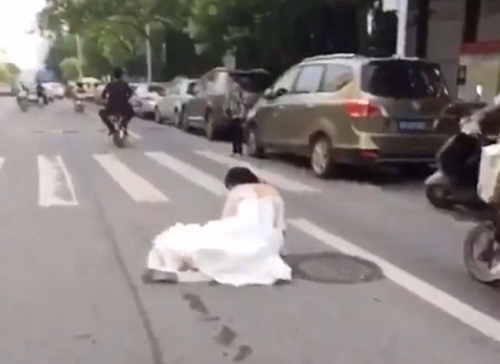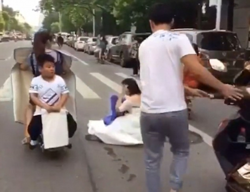 În filmarea prezentată de People's Daily Online se vede cum mirele își continuă neabătut traseul, în timp ce mireasa este cu picioarele însus și restul scuterelor opresc în ultima clipă să nu o lovească.