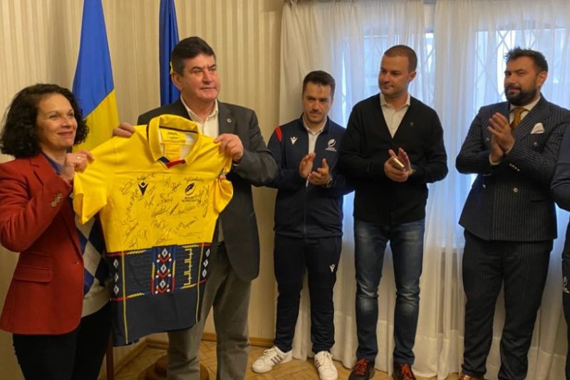 Echipa de rugby a României a înmânat doamnei Ambasador Ana Voicu tricoul nationalei României cu semnaturile jucătorilor.