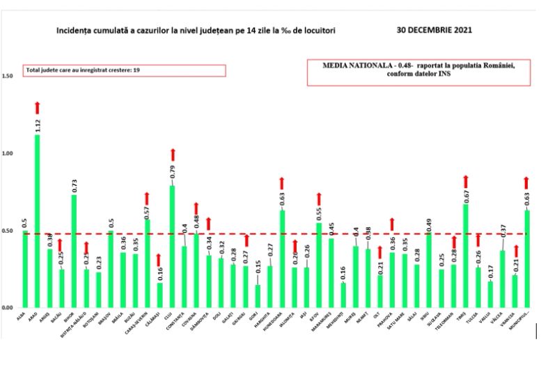 Coeficientul infectărilor cumulate la 14 zile, raportate la 1.000 de locuitori este calculat de către Direcțiile de Sănătate Publică, la nivelul Municipiului București și al județelor.