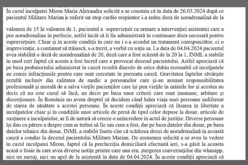 În schimb, am găsit un lucru care m-a făcut să mi se ridice părul în cap. Am aflat, citind motivarea judecătorilor, un element care nu apare în referatul procurorilor, pentru că, probabil, elementele din dosar, fiind foarte multe, s-a făcut o sinteză, și anume faptul că între primul moment, când doctorița i-a redus pacientului de 54 de ani noradrenalina la 1, și al doilea moment, după mai multe zile, adică în 4 aprilie, a existat un moment în care pacientul s-a simțit bine, a fost detubat, l-a vizitat soția și a stat de vorbă cu soția.