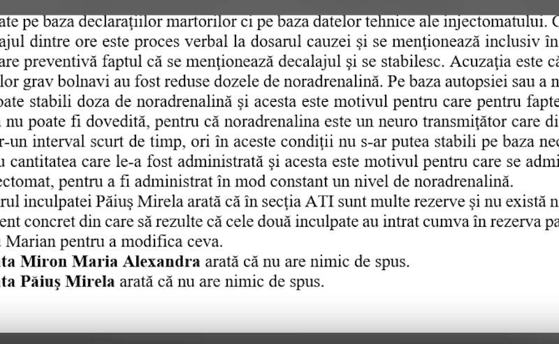 O sa vedeti in motivarea judecatorilor, ca este foarte important ce spun procurorii acolo pe baza informatiilor de la medicii legisti: Spun ca noradrenalina dispare foarte repede din corp si nu mai poti sa-ti dai seama cat a primit ca doza. Adica cei care au murit, degeaba se va face exhumarea, pentru ca nu mai poate nimeni sa isi dea seama.