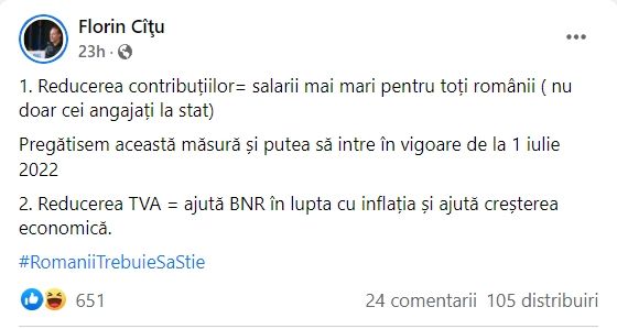 Pe de altă parte, liderul PNL vorbește despre reducerea TVA, măsură care "ar ajuta BNR în lupta cu inflația și ajută creșterea economică”.