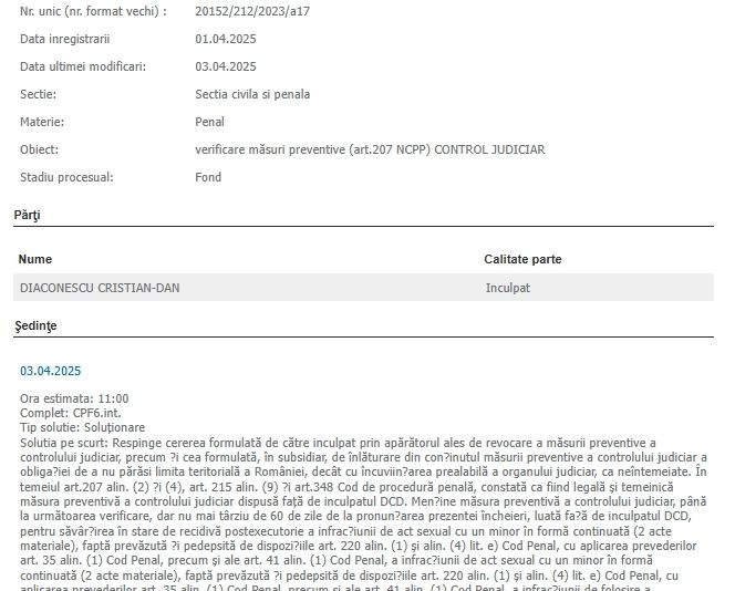 De asemenea, instanța a decis ca măsura preventivă să rămână în vigoare până la următoarea evaluare, dar nu mai târziu de 60 de zile de la pronunțarea încheierii. Diaconescu este acuzat de infracțiuni grave, printre care act sexual cu un minor în formă continuată (2 acte materiale) și folosirea prostituției infantile în formă continuată (2 acte materiale), fapte stipulate și sancționate de Codul Penal. Aceste acuzații au fost formulate în cadrul unui dosar penal deschis împotriva sa, iar măsura controlului judiciar are rolul de a preveni eventuale abuzuri sau fapte penale suplimentare.