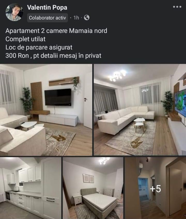 Individul a dat țepe mai multor persoane, folosindu-se, cel mai probabil, de un nume și o poză false! A postat câteva fotografii cu un apartament din Mamaia Nord pe care l-ar fi închiriat cu 300 de lei. Mai mult, i-a propus unei turiste care voia cazare la mare și care l-a abordat, în urma anunțului postat, să-i dea gratis apartamentul pentru 6 nopți, dacă aceasta ar fi acceptat să-i dea... „altceva” la schimb.