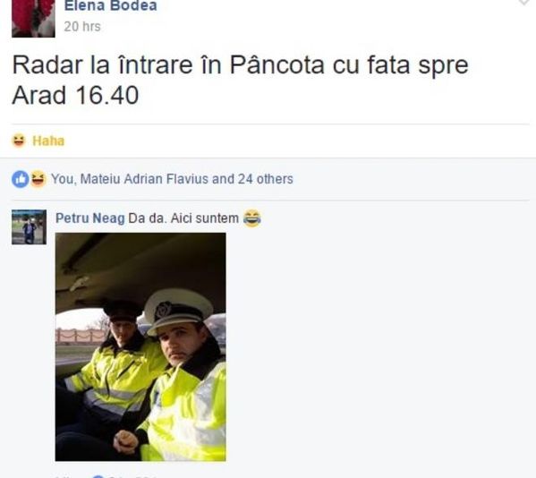 O şoferiţă a avertizat pe Facebook: ”Radar la intrarea în Pâncota”. Reacţia poliţiştilor e genială