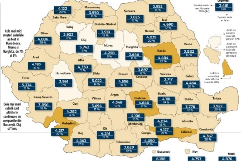 În contrast, județele Hunedoara, Mureș și Harghita au raportat cele mai mici creșteri salariale în aceeași perioadă. Totuși, Bucureștiul, Clujul și Timișul rămân în fruntea listei cu cele mai mari salarii oferite de companii, cu un venit net de aproape 6.200 de lei.