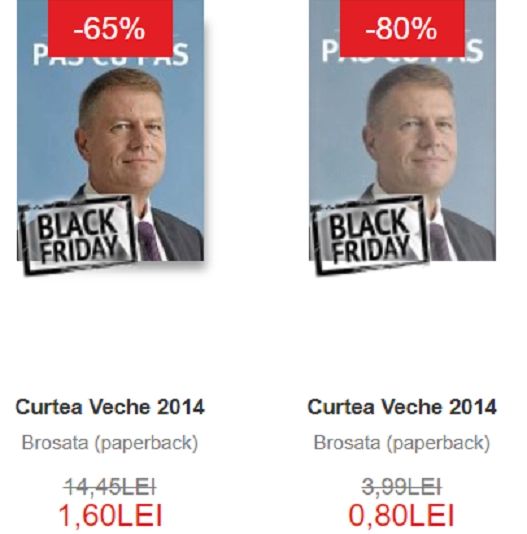 Două oferte de lichidare de stoc au ca obiect cartea președintelui: una cu prețul de 1,60 lei, 65% reducere de la 14,45 lei, iar a doua de 80 de bani, o reducere de 80% față de prețul anterior.