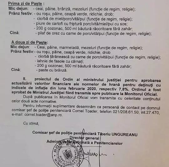 Persoanele private de libertate vor primi în prima zi de Paşte: Mic dejun: ou roşu, pâine, ceapă verde, ridichie, ceai, drob/mezeluri; Prânz: – ciorbă de miel/porc/vită/pui; – piure de cartofi cu friptură porc/vită/miel/pui cu sos; Cină: pilaf de orez cu legume. În a doua zi de Paşte, deținuții vor avea pe masă: Mic dejun: ou roşu, pâine, ceapă verde, ridichie, ceai, mezeluri, marmeladă;