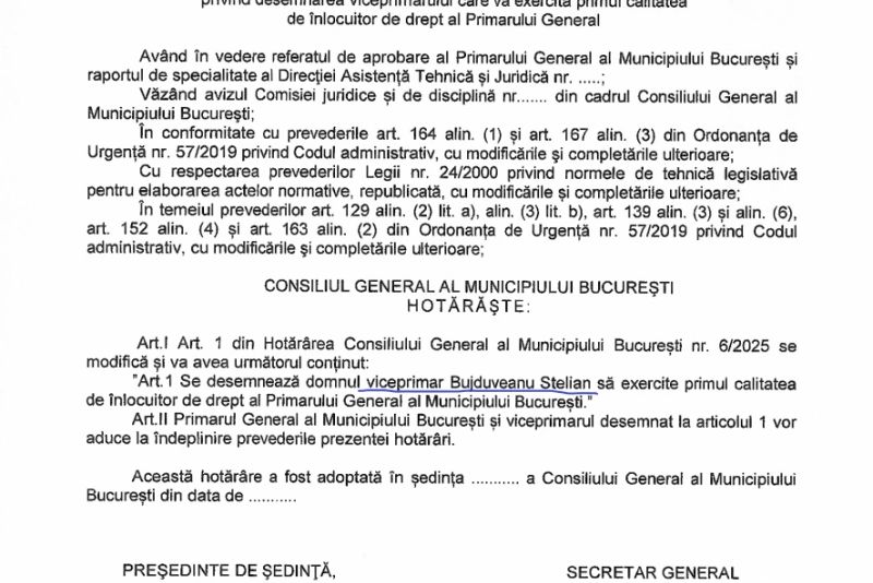 Noul proiect de hotărâre, semnat deja de Nicușor Dan, il propune pe Stelian Bujduveanu (PNL), ca primar interimar.
