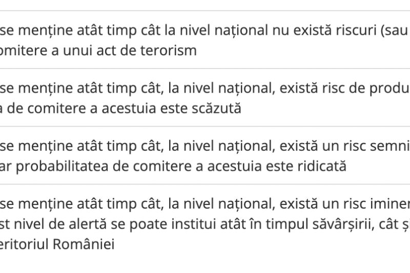 În prezent, nivelul de alertă este „albastru-precaut”, ceea ce înseamnă că nu există indicii concrete privind o amenințare iminentă, însă instituțiile responsabile mențin măsuri preventive și monitorizarea atentă a situației de securitate.