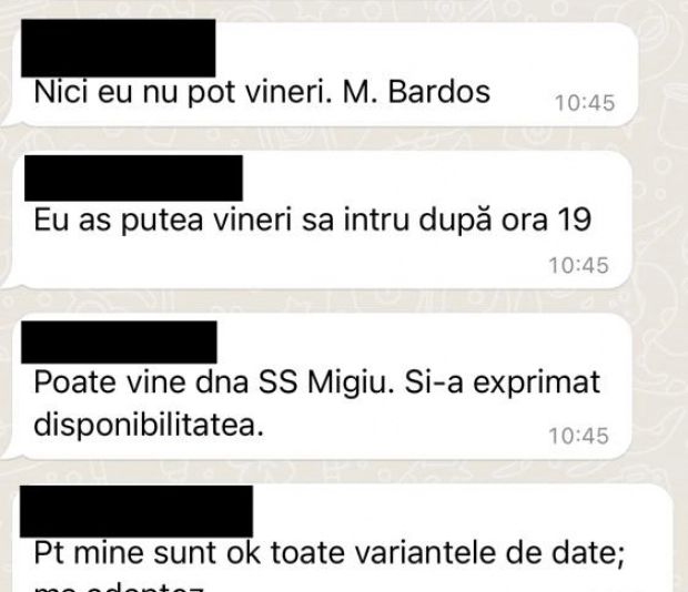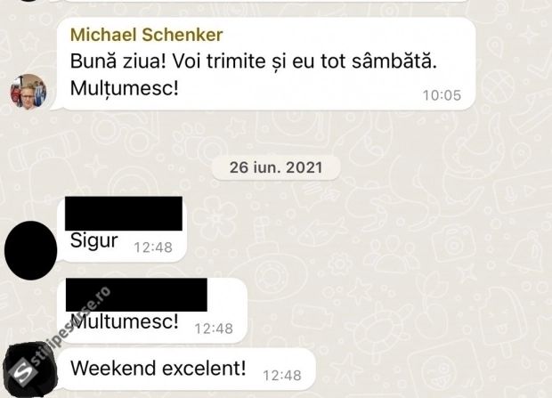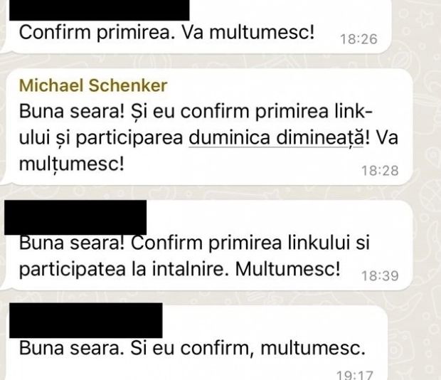 „Bună seara! Și eu conform primirea link-ului și participarea duminică dimineață. Vă mulțumesc”, scrie M. Schenker, într-un mesaj pe WhatsApp datat 8 mai 2022.