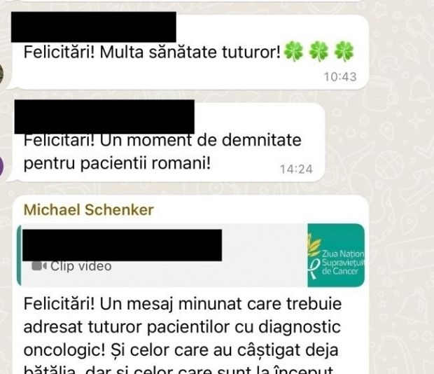 În alt mesaj, când cineva de pe grupul de WhatsApp a postat un mesaj video de Ziua Națională a Supraviețuitorilor de Cancer, Schenker a replicat: „Felicitări! Un mesaj minunat care trebuie adresat tuturor pacienților cu diagnosctic oncologic! Și celor care au câștigat deja bătălia, dar și celor care sunt la început de luptă (sau în plin război) și au nevoie de încurajare și susținere! Felicitări pentru idee și conținut!”, puncta Michael Schenker, la 29 mai 2022.